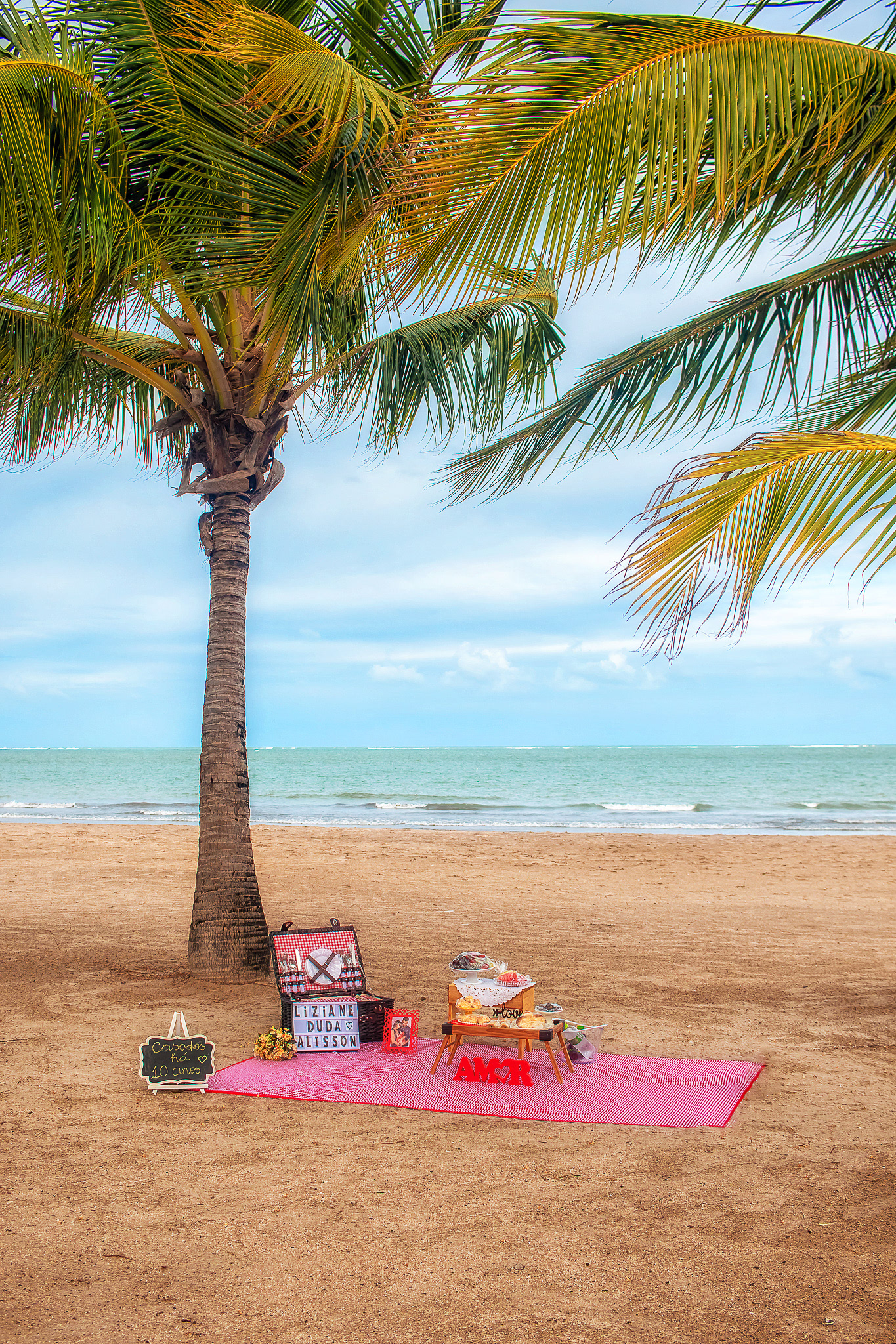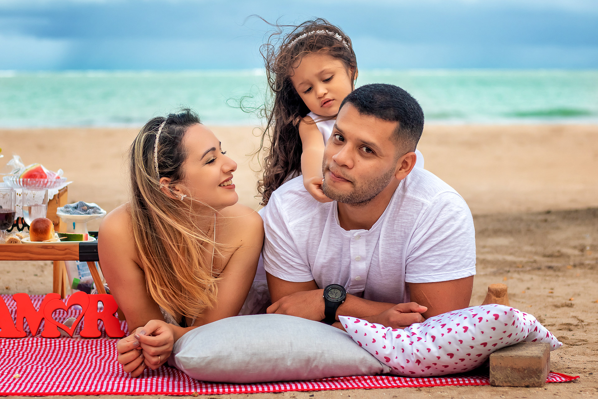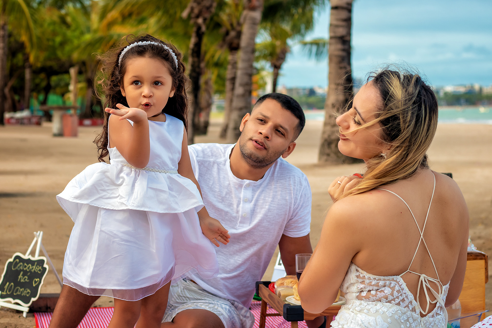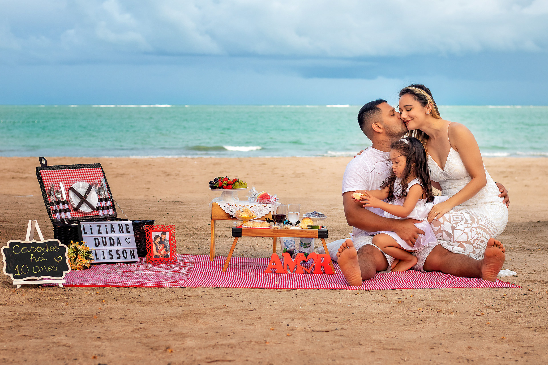 Ensaio fotográfico de família com piquenique romântico para comemorar os 10 anos de casado. Realizado na praia de Pajuçara, em Maceió/AL.