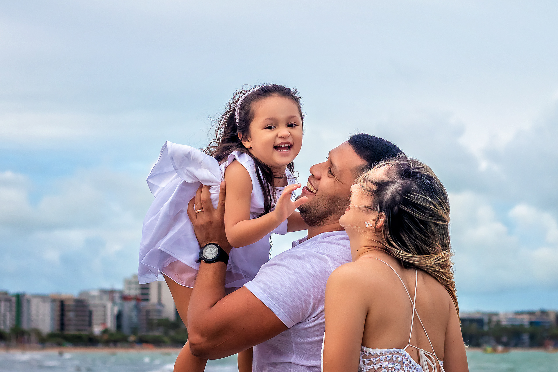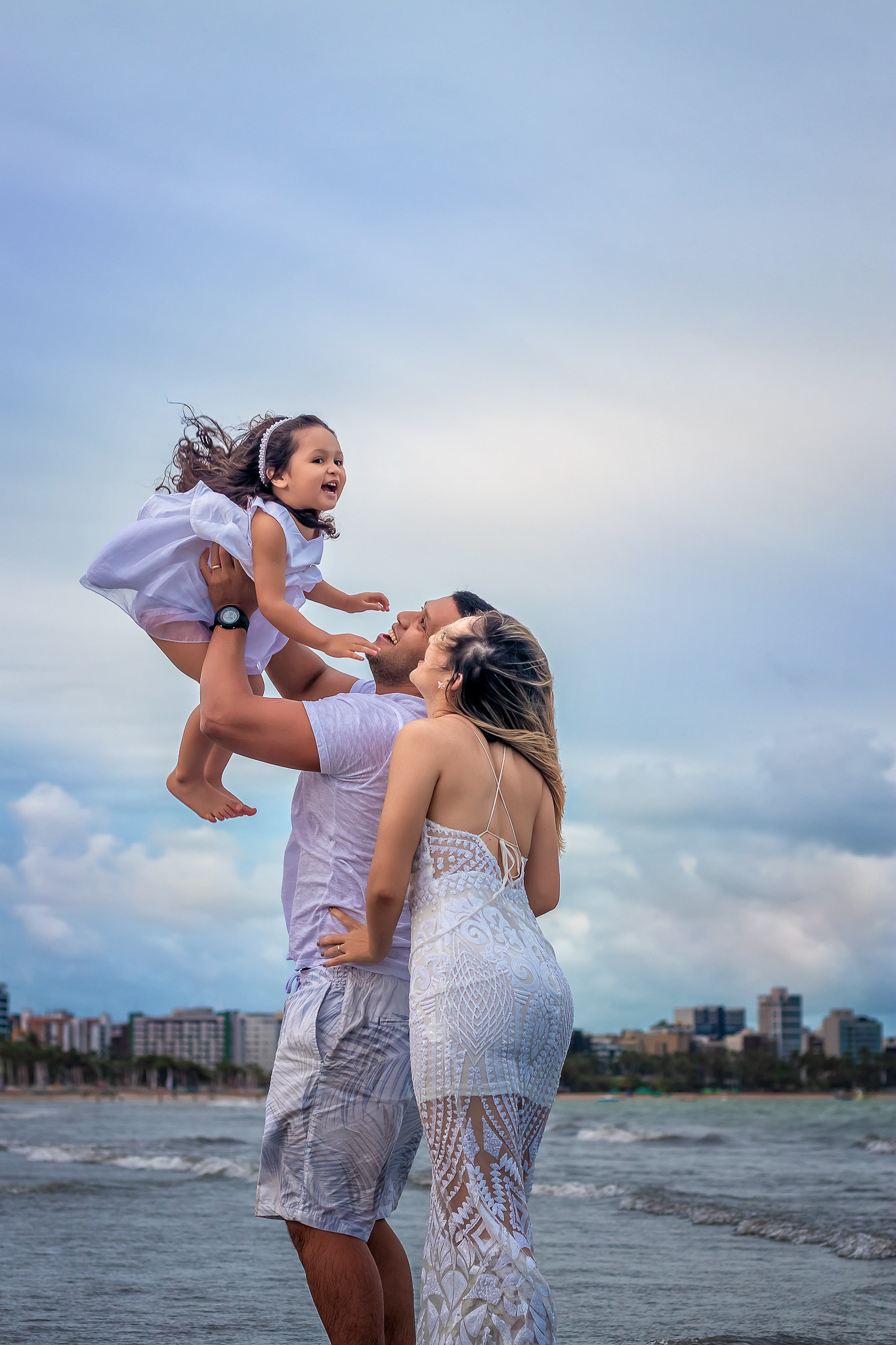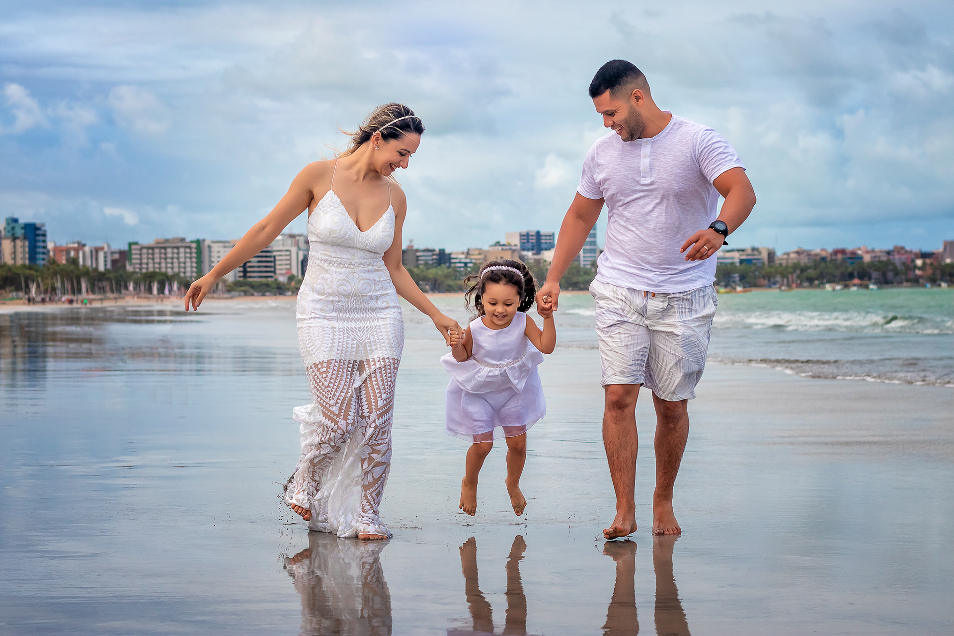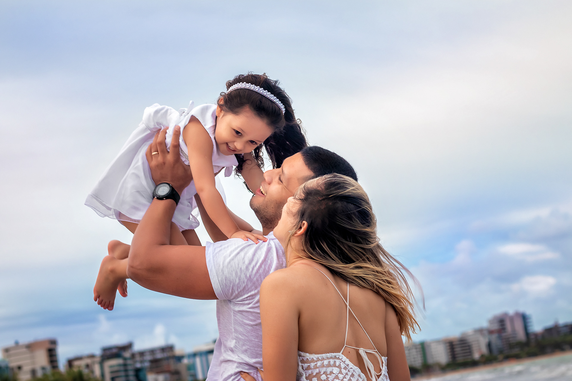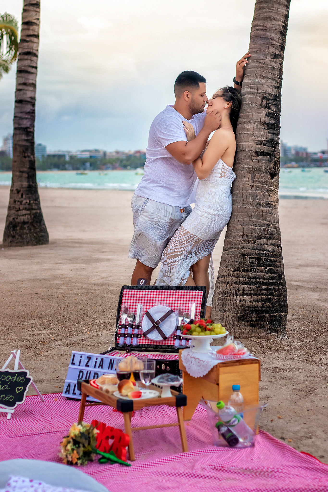 Ensaio fotográfico de família com piquenique romântico para comemorar os 10 anos de casado. Realizado na praia de Pajuçara, em Maceió/AL.